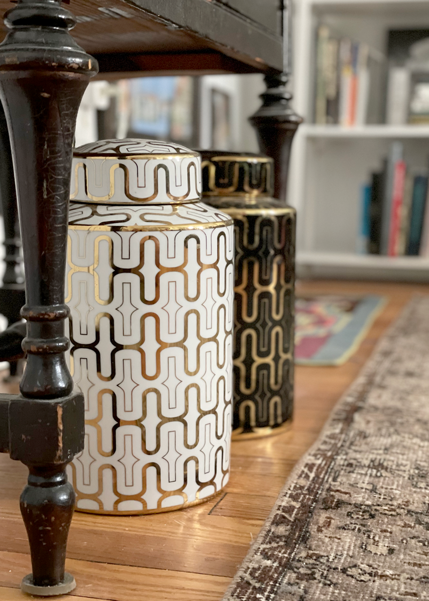 The wall of art kept growing β flea market oil paintings, vintage subway ad clippings, a framed postcard from a friend in Lisbon. The jars stood below, on either end of the credenza, like sentinels. Black and white. Gold and glossy. Like bouncers for the gallery wall. No riffraff past this point.