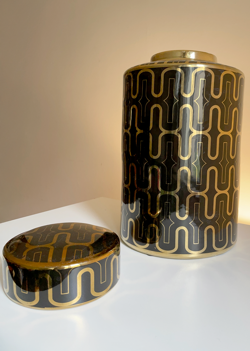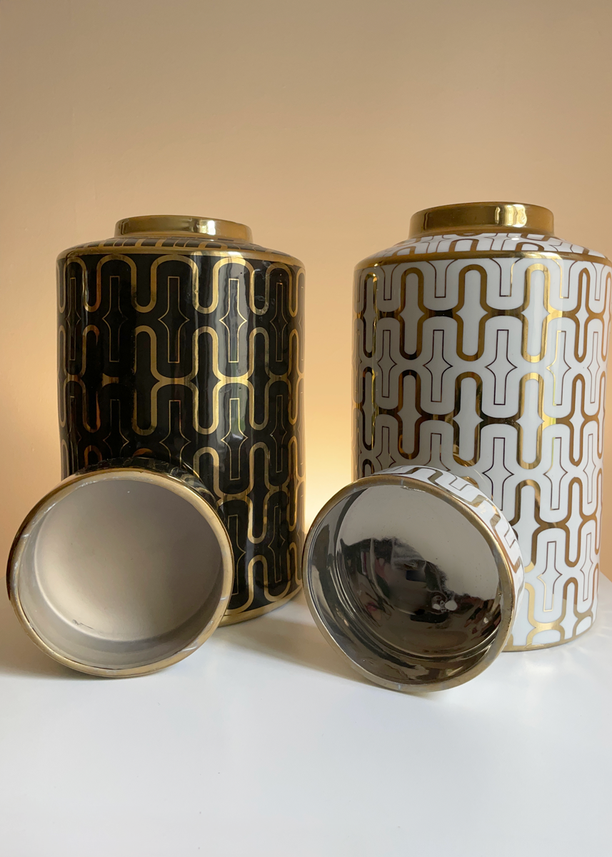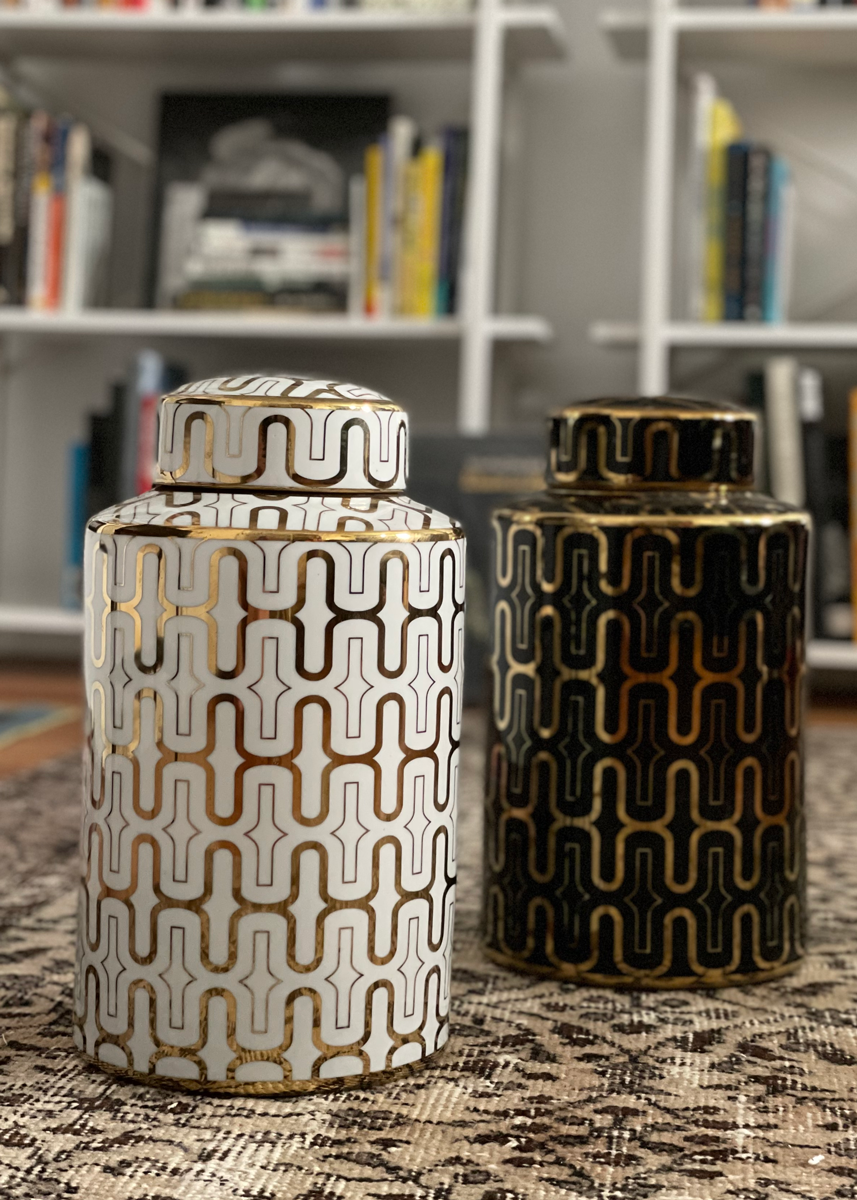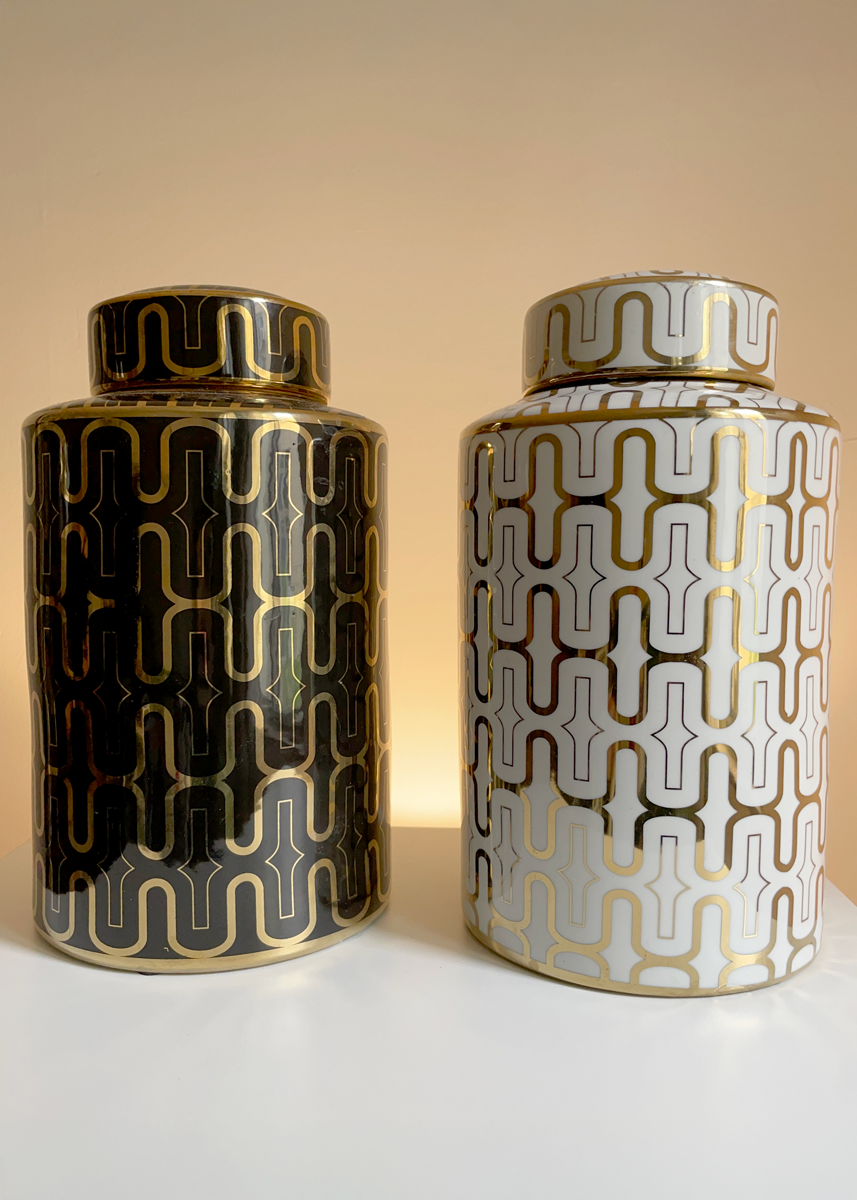 Set of two large decorative ceramic jars by Sagebrook Home β one glossy black with gold geometric design, the other white with a matching gold motif β and bold modern forms. Measuring 12″ tall and 7″ across, these cylindrical jars feature removable lids, that reveal a wide mouth opening. A bold modern statement with minimalist appeal.