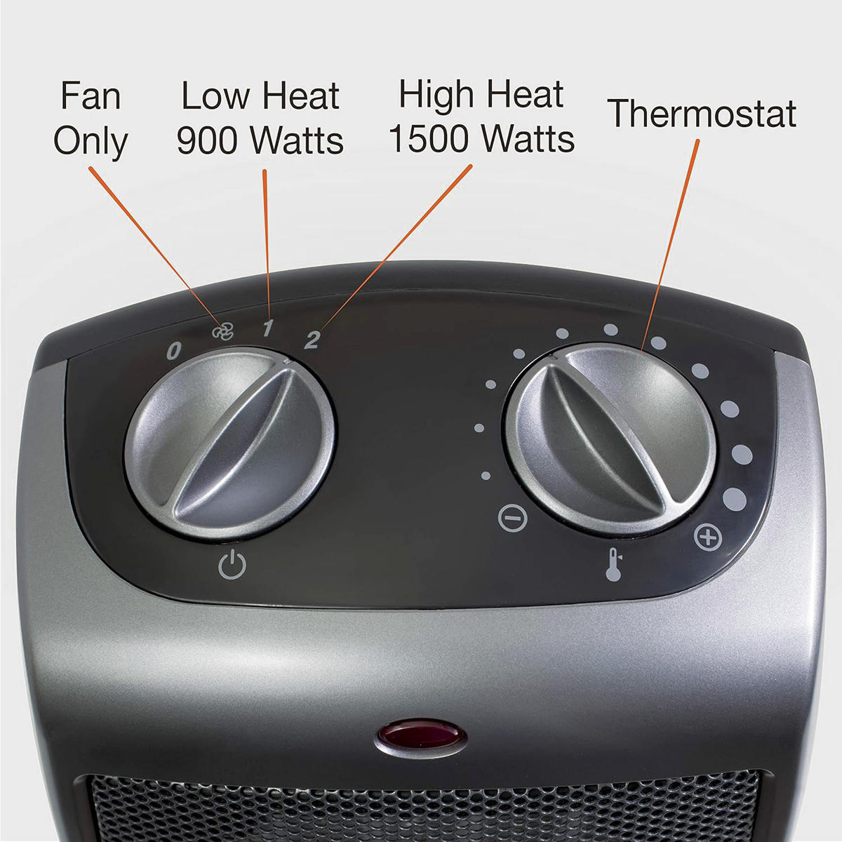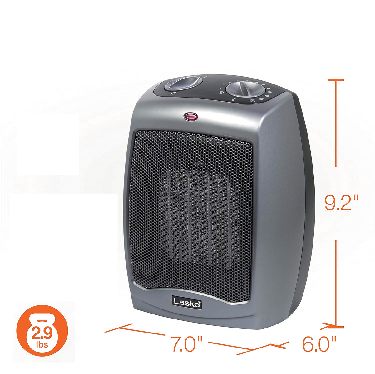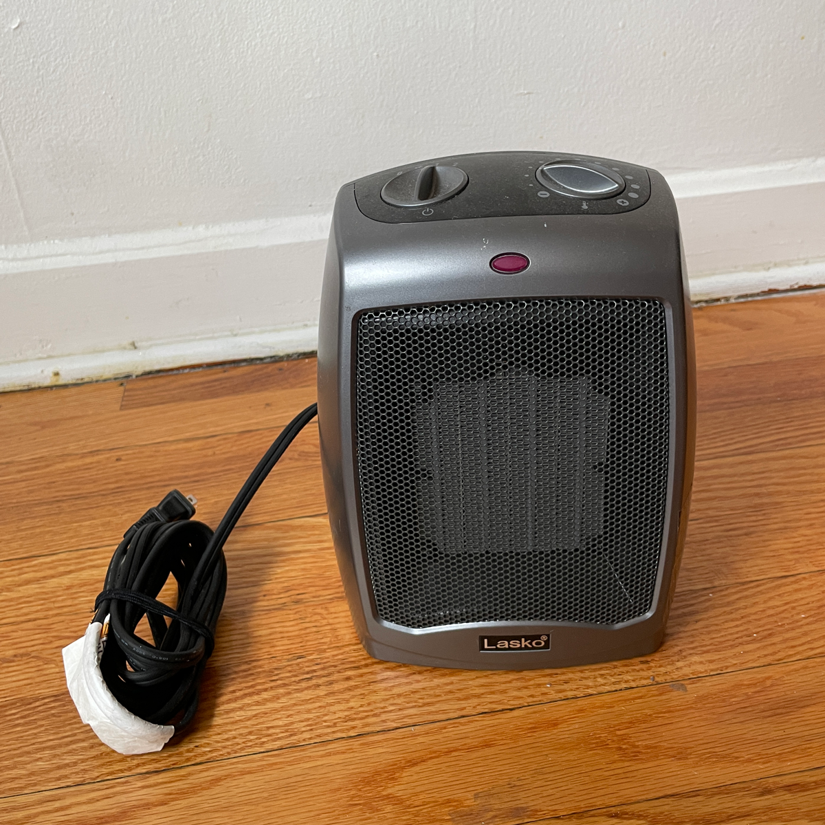 Compact ceramic heater by Lasko β powerful enough to warm your toes, quiet enough for office use, and safe enough to leave under your desk. Features tip-over protection, overheat shutoff, a manual thermostat, and two heat settings. Only used once, then stored clean and dry.